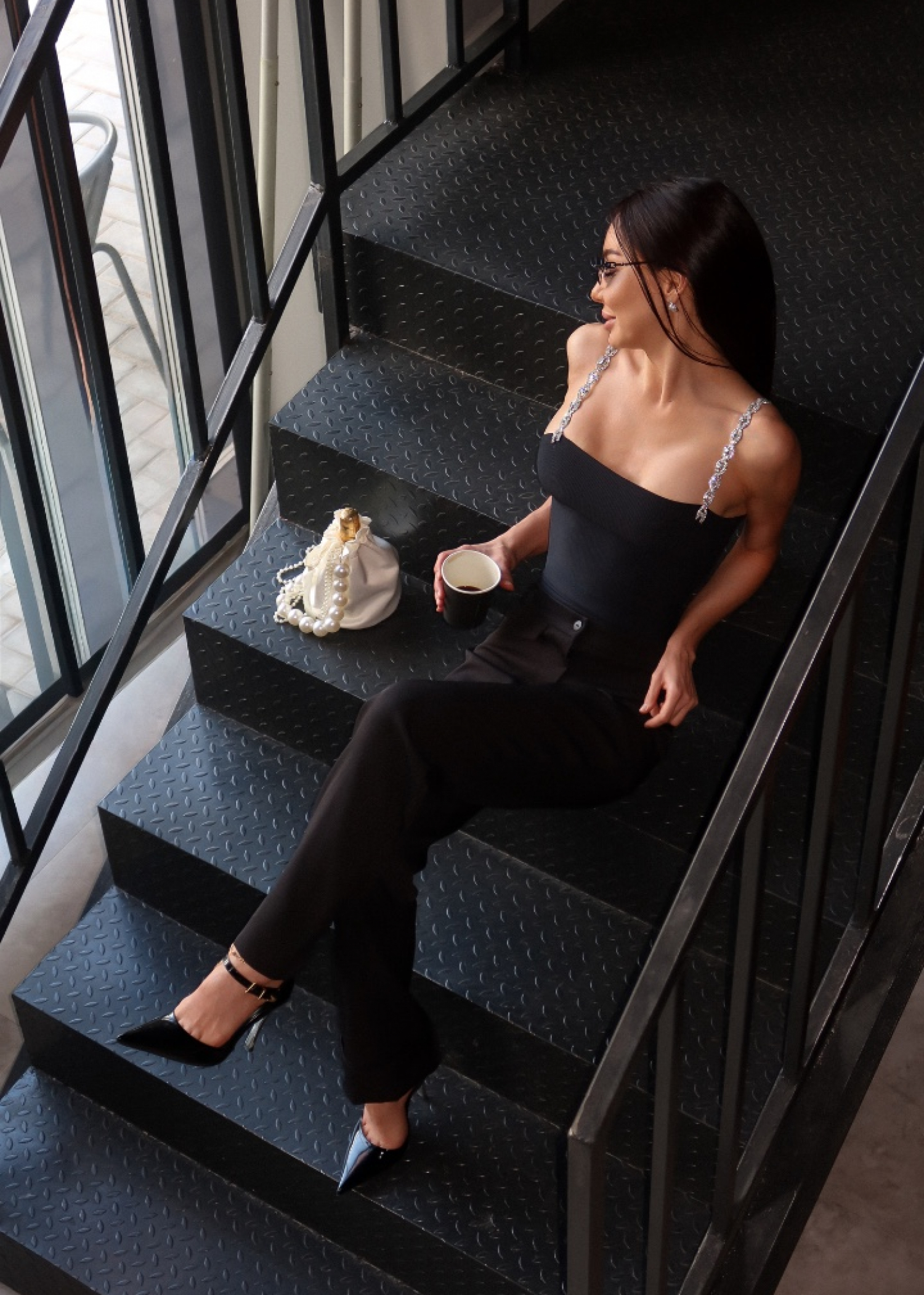 ультразаметная посадка классических брюк с открытой линией талии и акцентом на блестящем декоре из страз. Смелый силуэт, подчеркивающий фигуру - одновременно смело и утонченно, как мы любим.