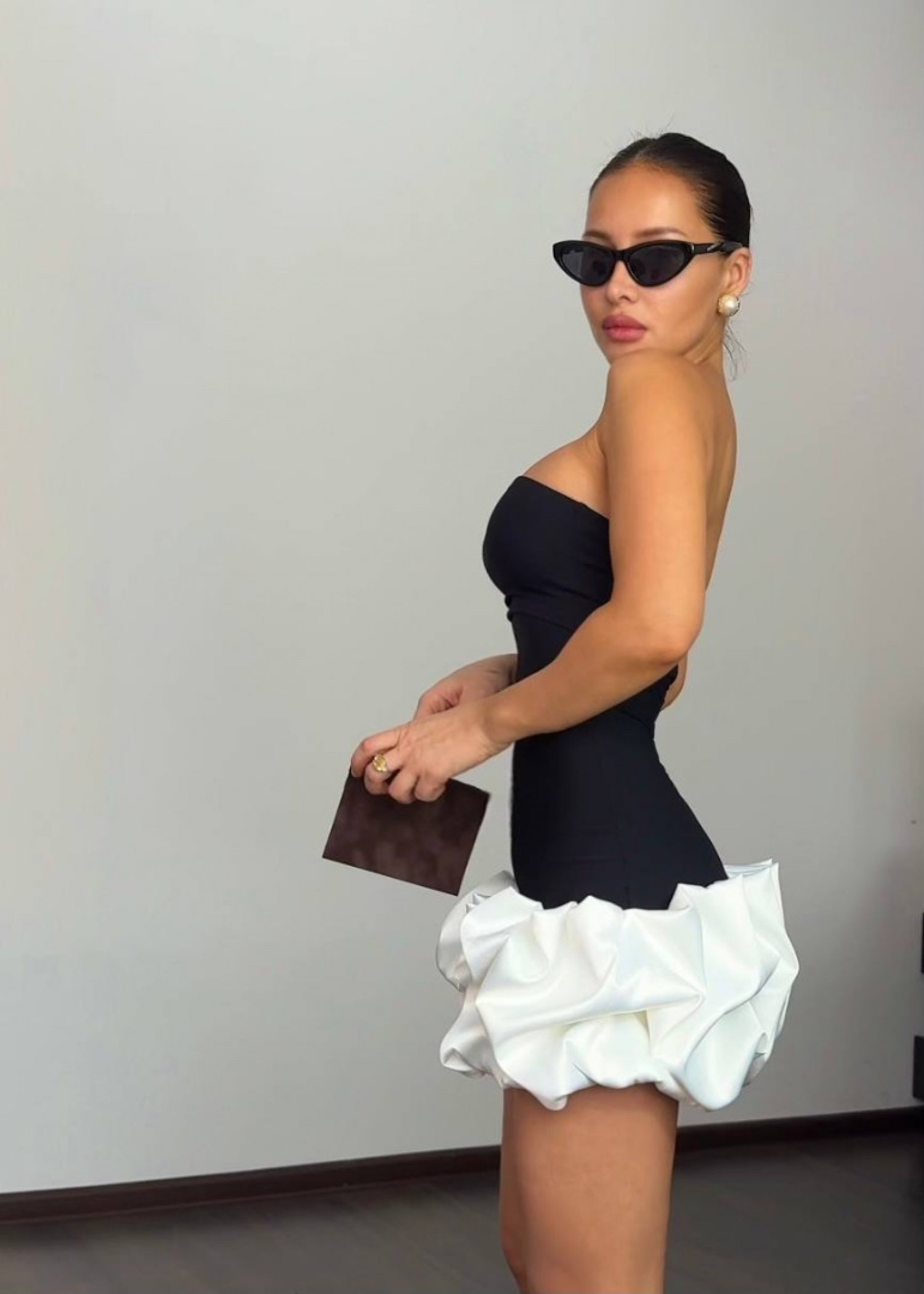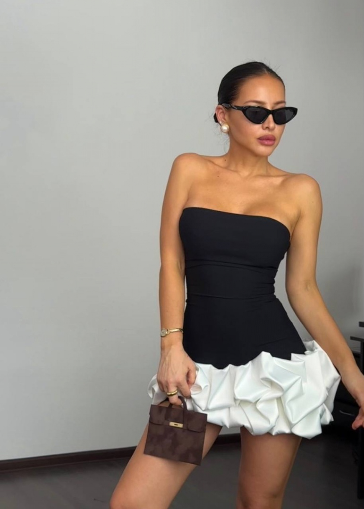 коктейльное платье мини с воланом, который допускается носить в двух вариантах- сверху и снизу, благодаря эластичным свойствам ткани.